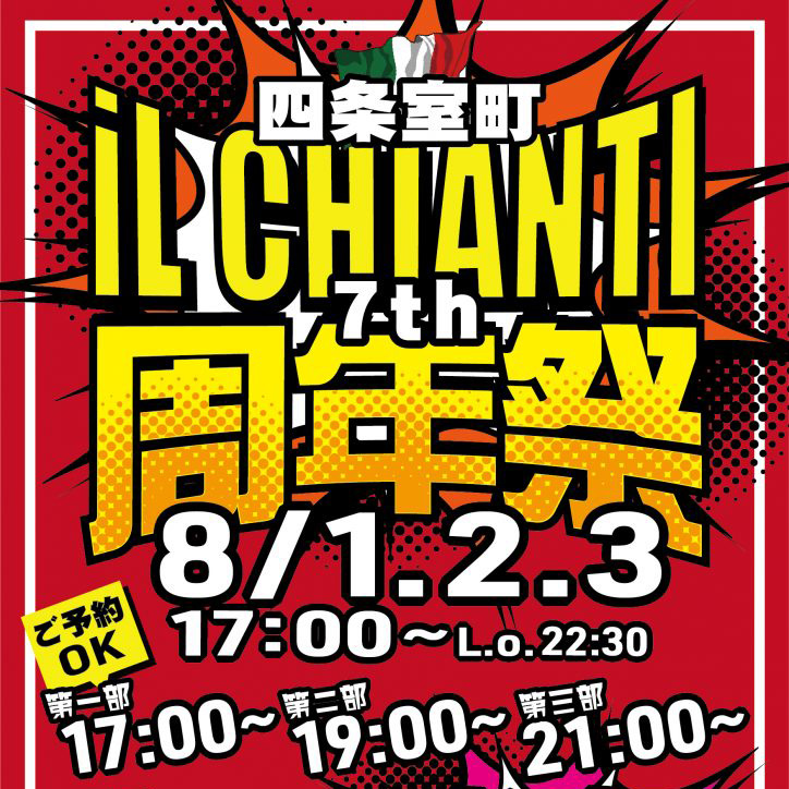 8/1(金)~ 8/3(日)イルキャンティ京都 四条室町店7周年祭 開8/1(金)~ 8/3(日)【イルキャンティ京都 四条室町店】7周年祭 開