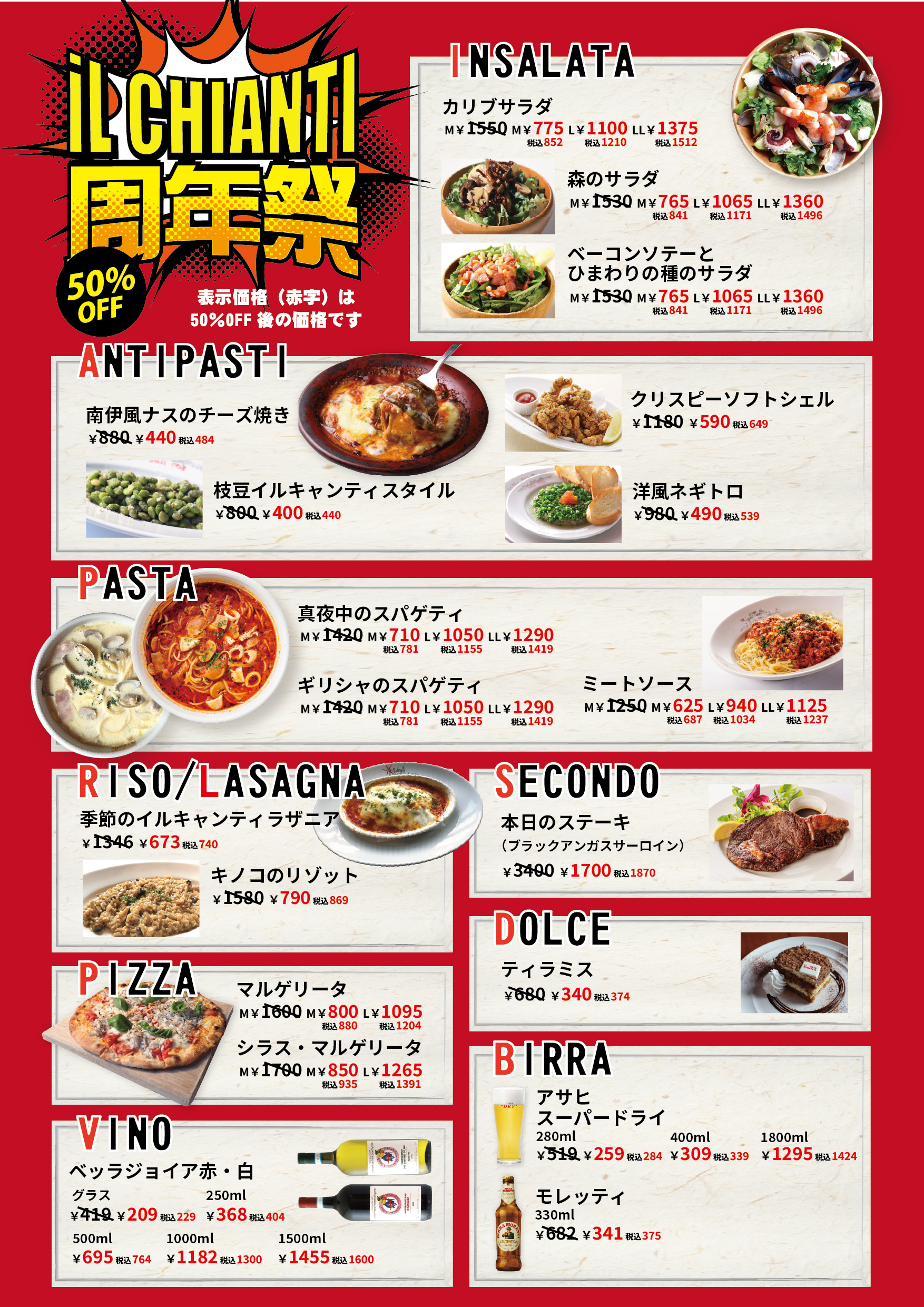 ワイン・生ビールなど対象ドリンクも半額でお楽しみいただけます。