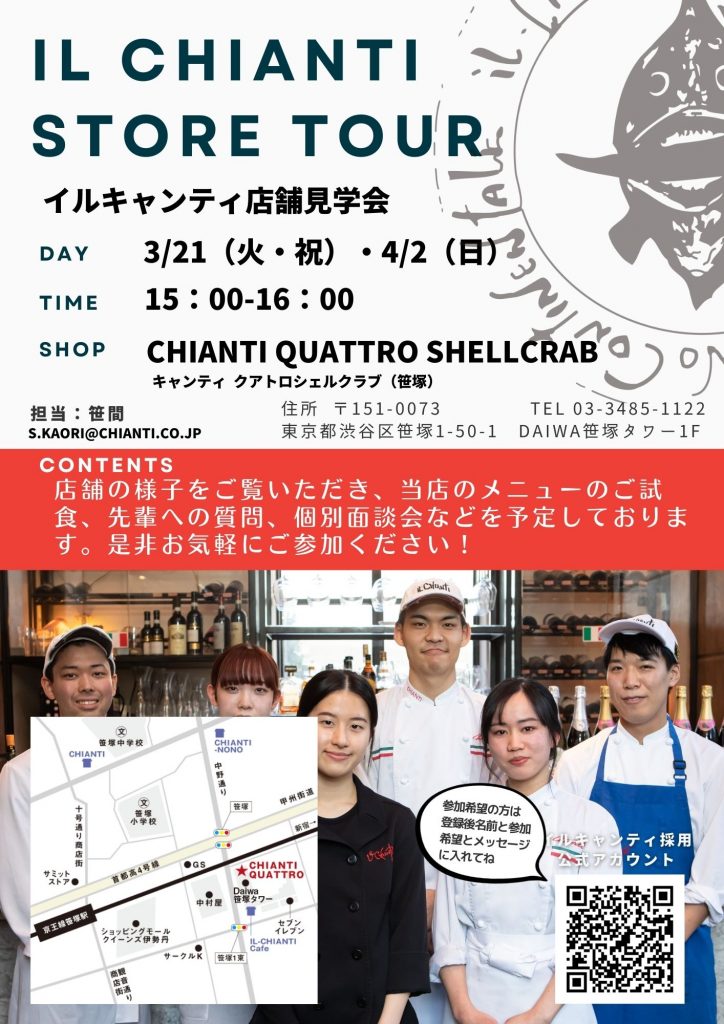3/21(火・祝)・4/2(日)に、笹塚のキャンティ・クアトロシェルクラブにて店舗見学会を実施いたします。店舗の様子をご覧いただき、当店のメニューのご試食、先輩への質問、個別面談会などを予定しております。是非お気軽にご参加ください!各日程15時に店舗集合。参加をご希望の場合はメールもしくは公式LINEアカウントから事前にお知らせください。