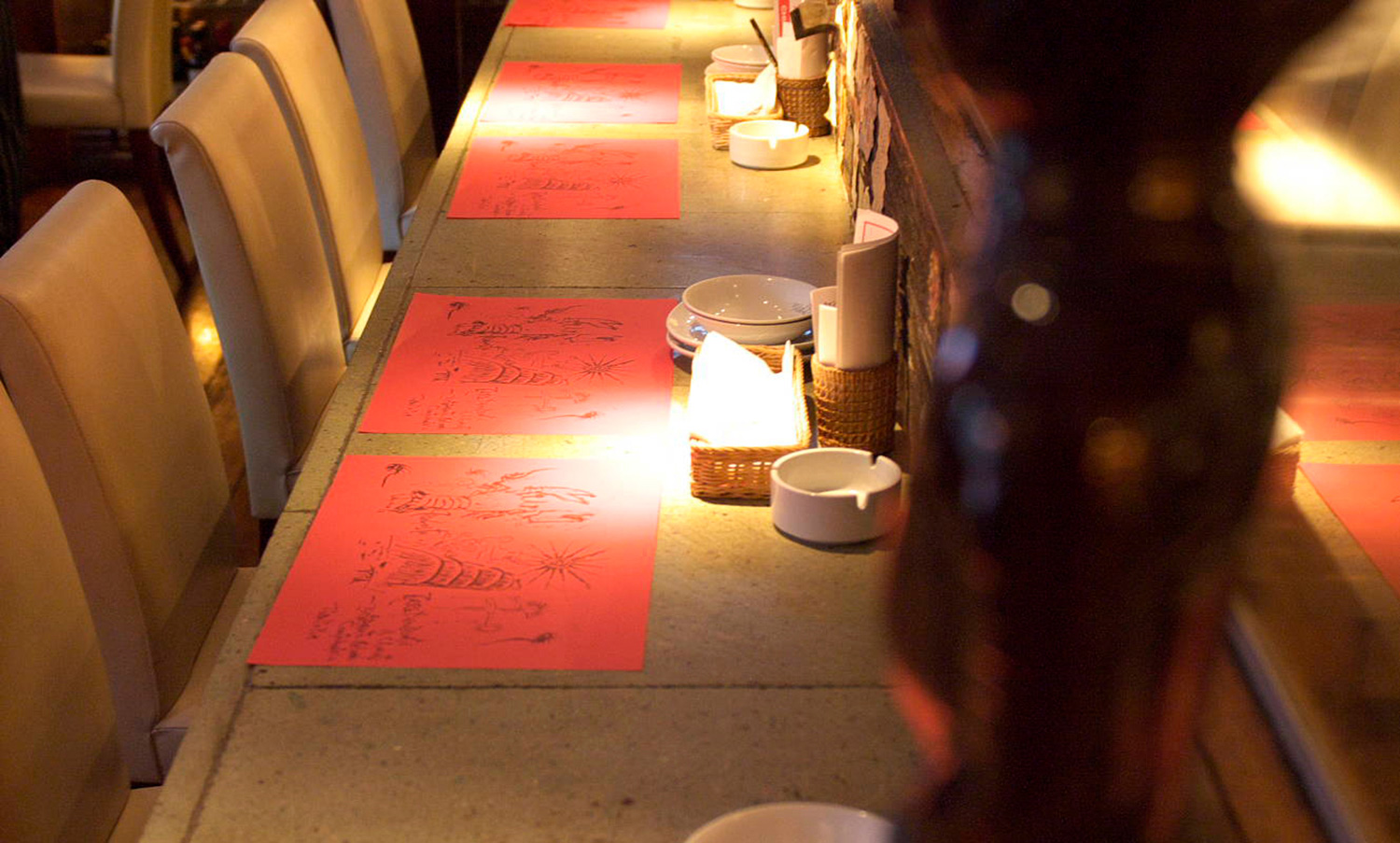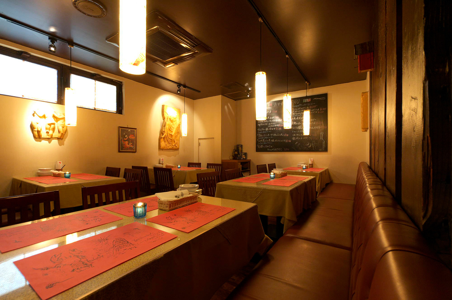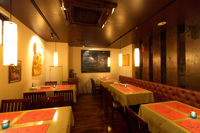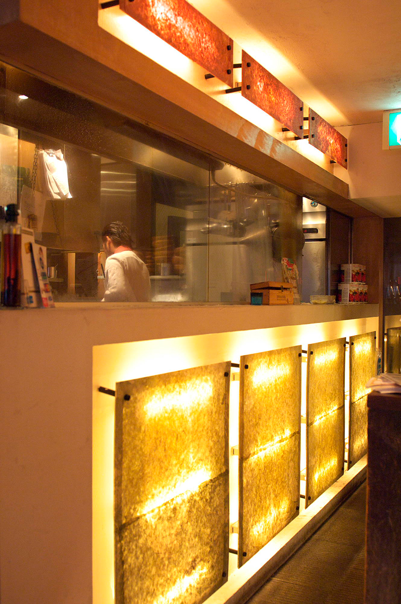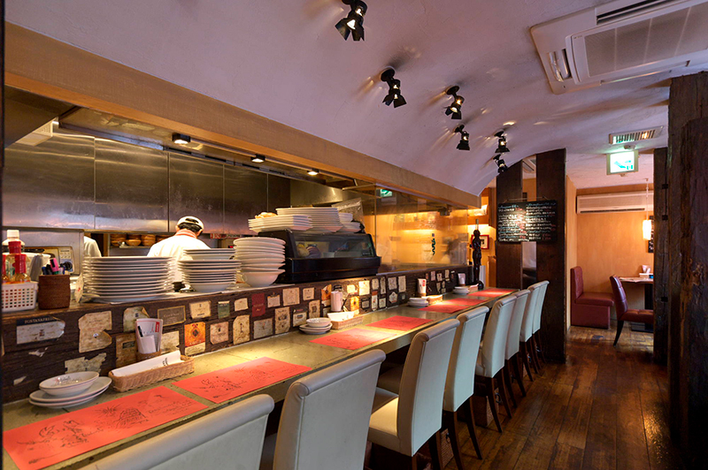 調理場を中心に、回廊式にテーブル席が並び迷路のように次々と異なる空間が現れるーー