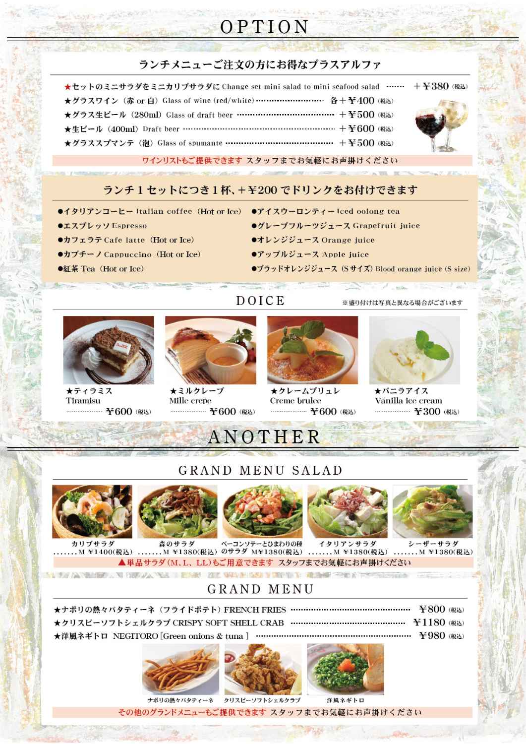 | 営業時間 | ●ランチ [月-金]11:30〜14:30(L.O.14:00) [土日祝]11:30~15:30(L.O.14:30) ●ディナー [月-金]17:30~23:00(L.O.22:00) [土日祝]17:00~23:00(L.O.22:00) 【注意】混雑時や予約状況により、2時間制とさせていただく場合がございます。 |